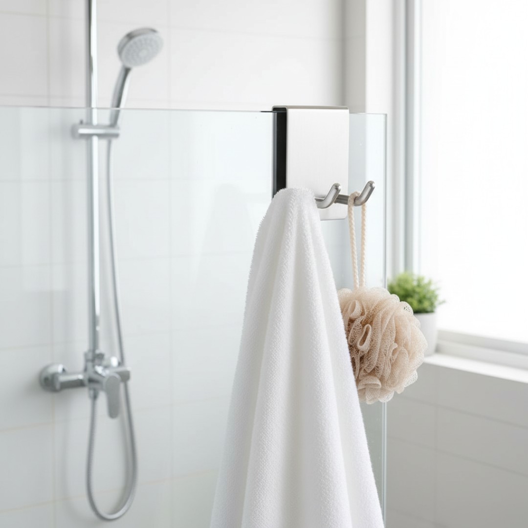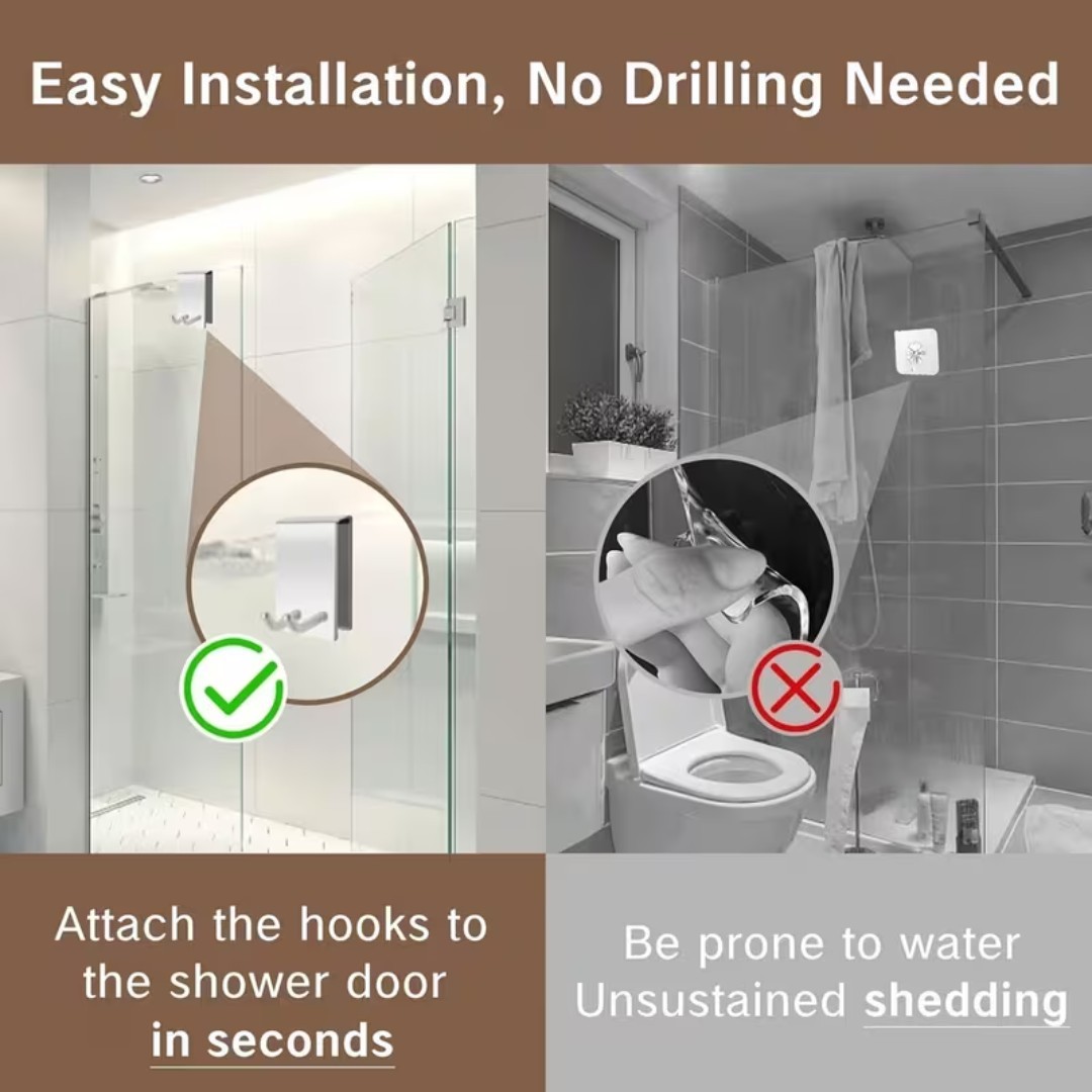 No-Drill Glass Door Installation: Designed to hang securely over frameless shower doors without drilling, screws, or adhesives, ensuring quick and damage-free setup.