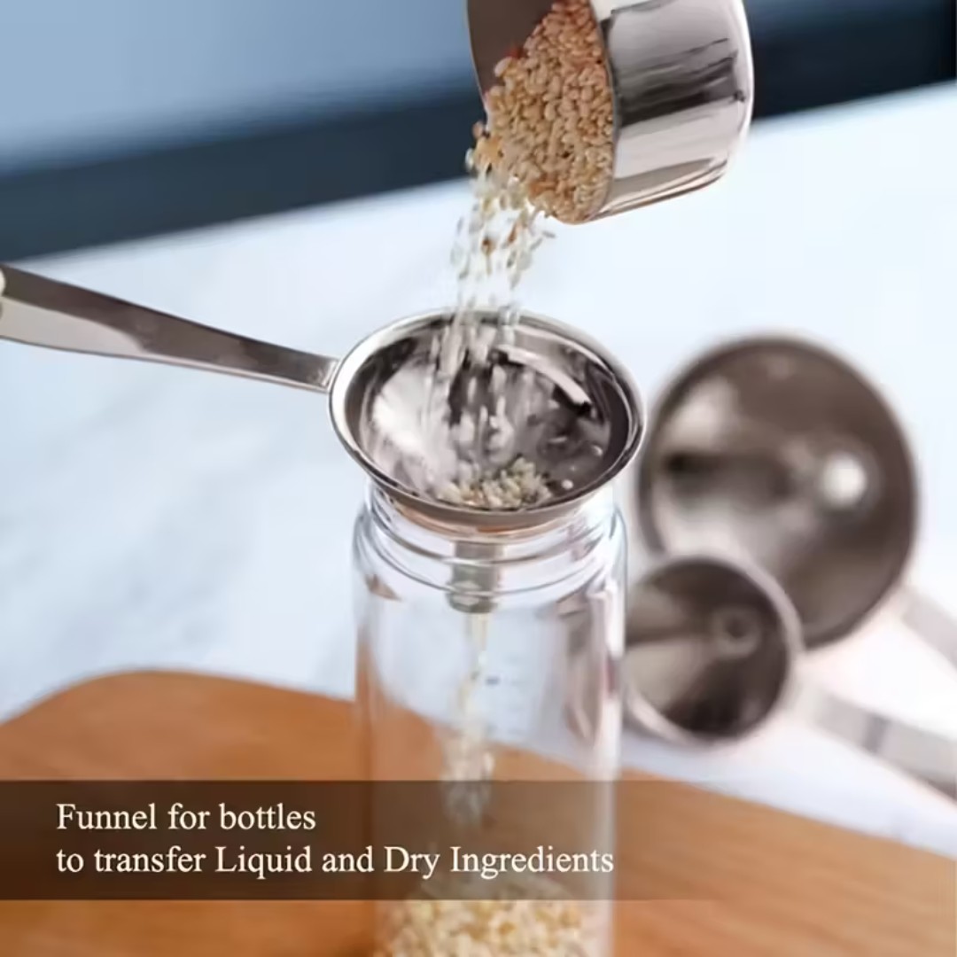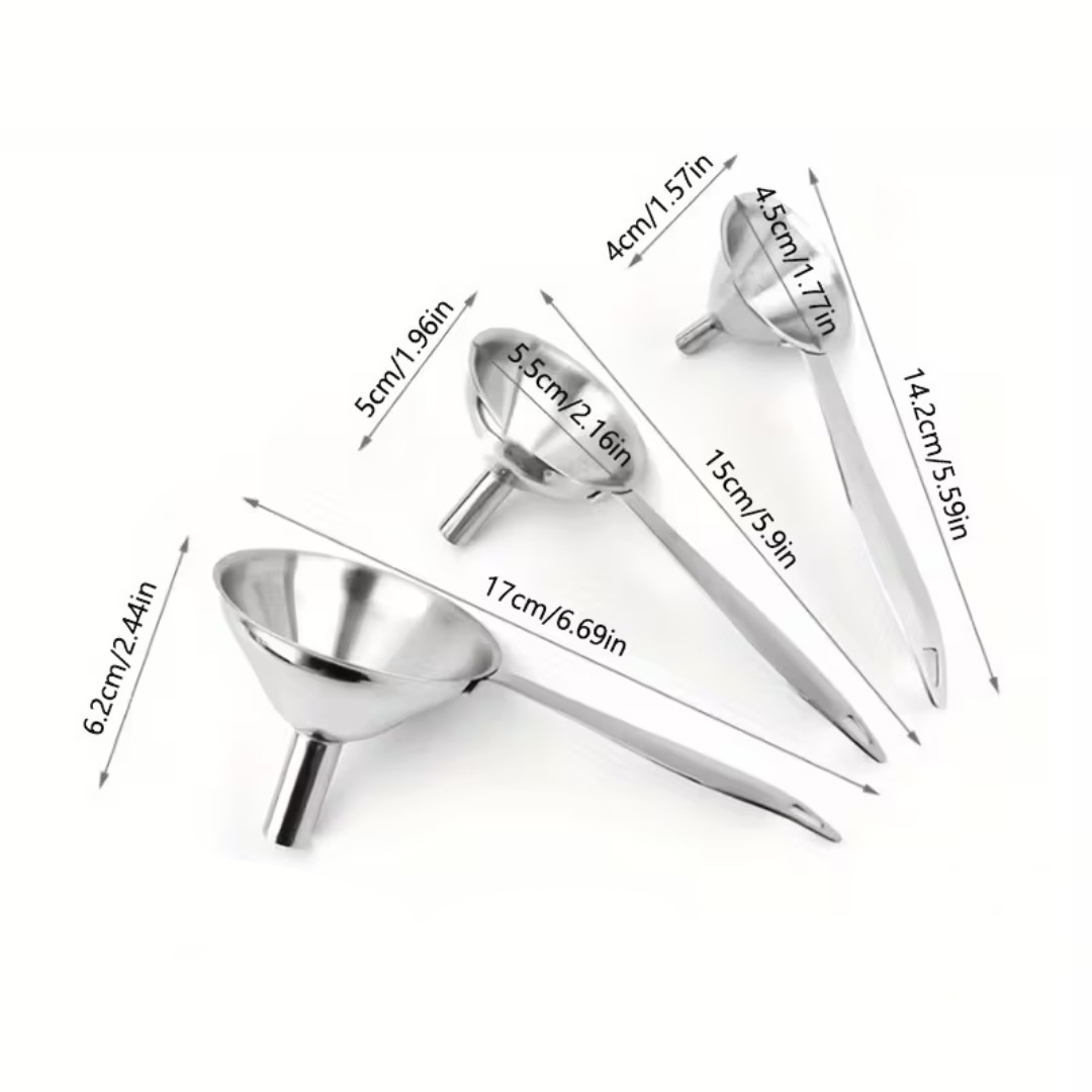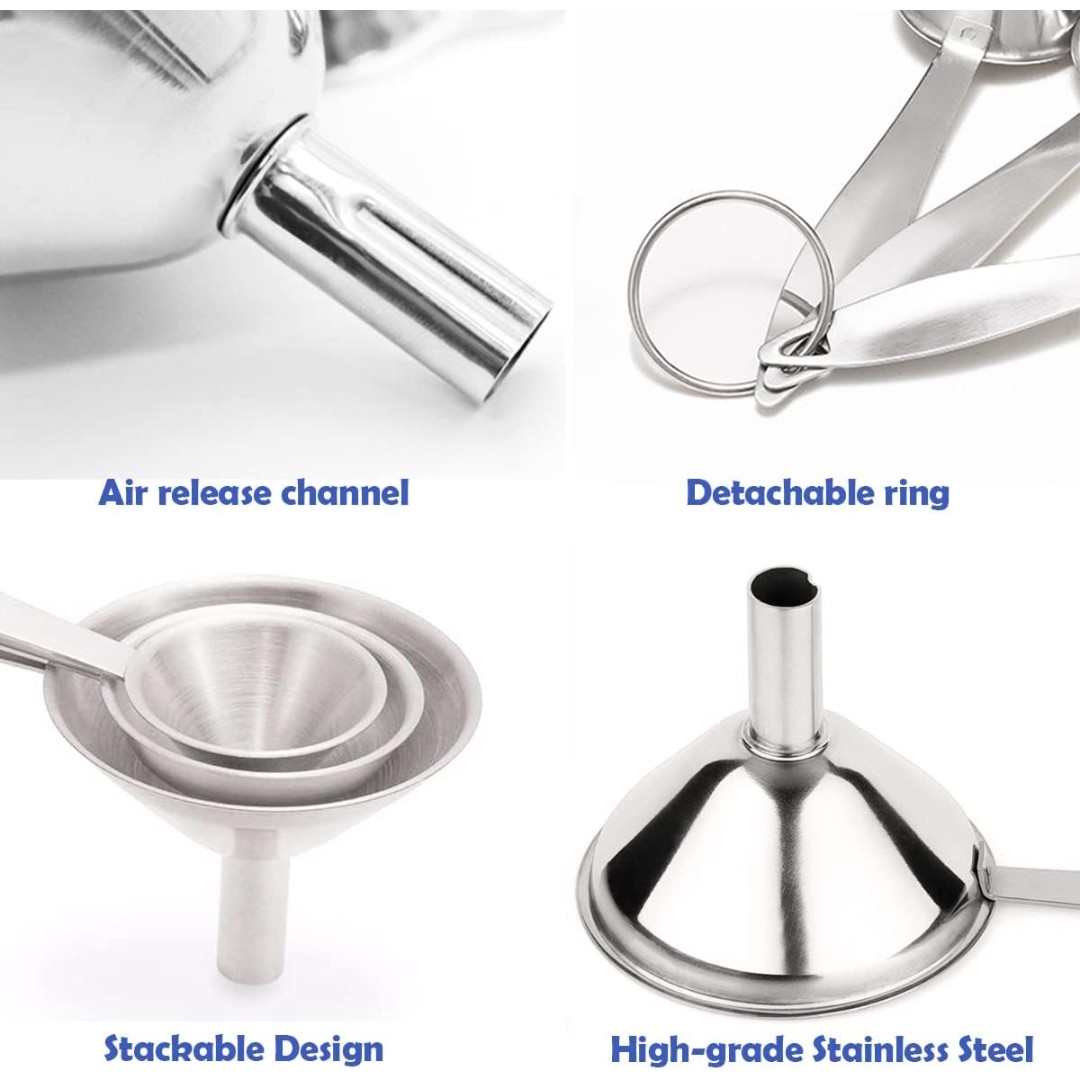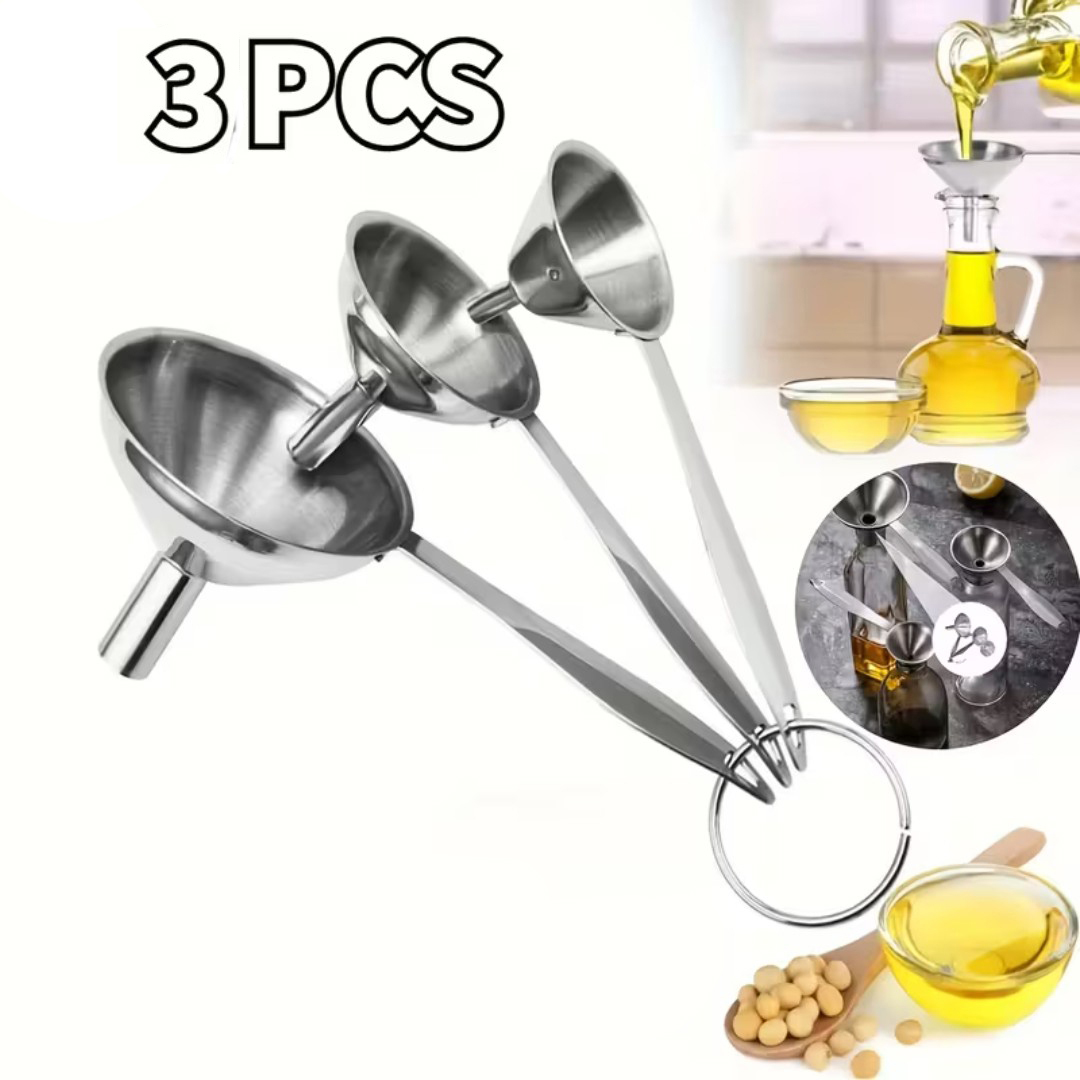 3-Piece Funnel Set: Includes three different funnel sizes to handle various pouring tasks, from oils and sauces to liquids and dry ingredients.