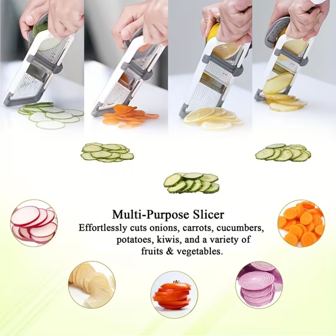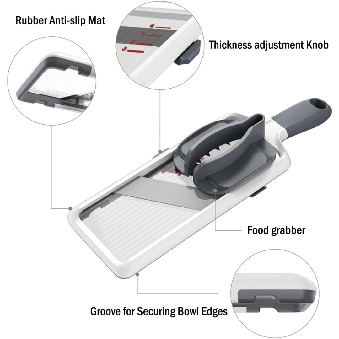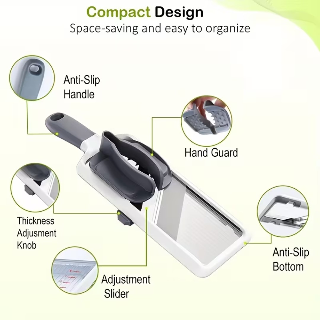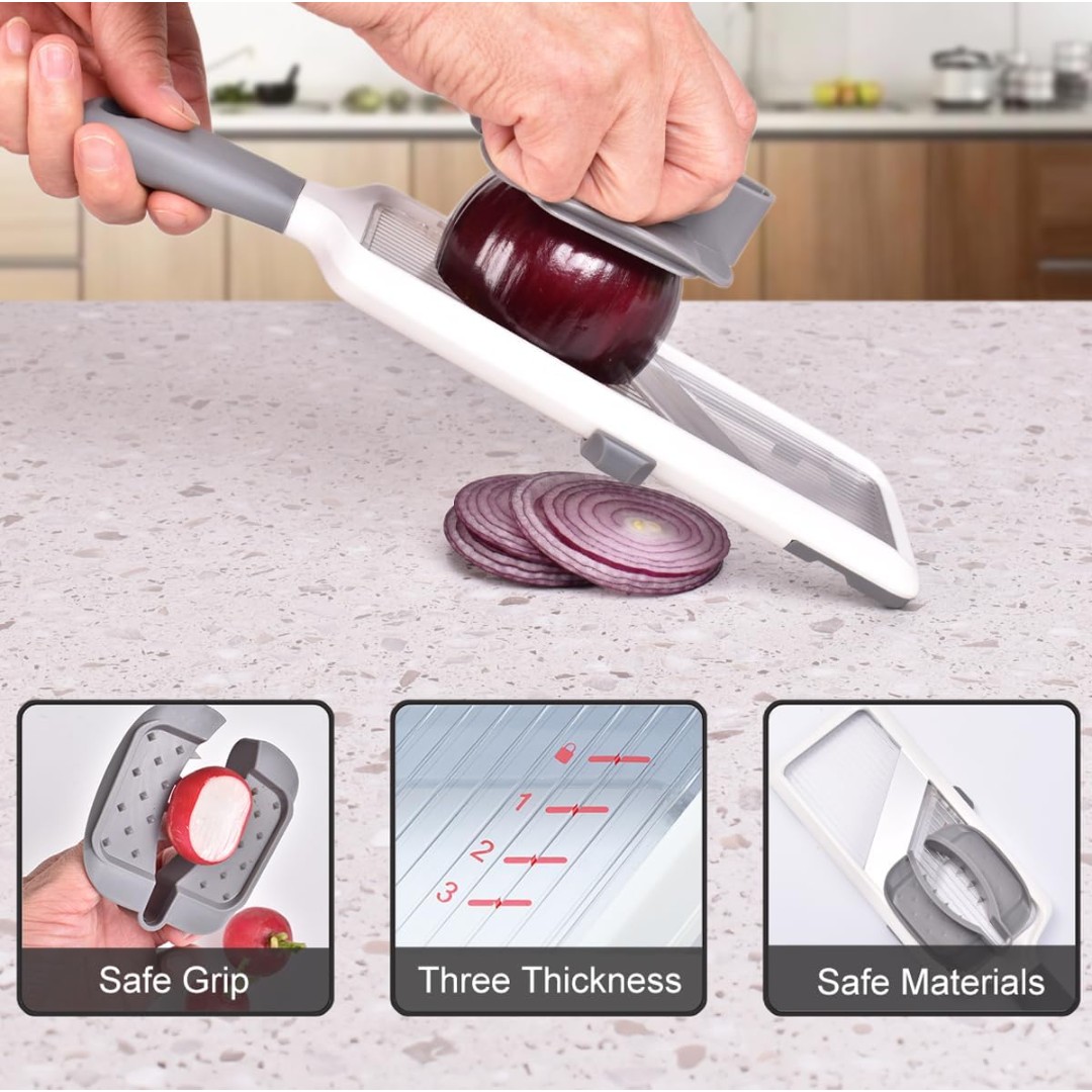 Adjustable Slice Thickness: Integrated thickness guide allows you to create uniform slices for salads, garnishes, and cooking prep.