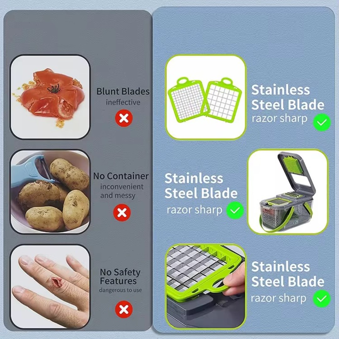 Multi-Function Cutting System: Includes multiple interchangeable blades for slicing, dicing, grating, julienne, and chopping fruits, vegetables, and cheese with precision.
