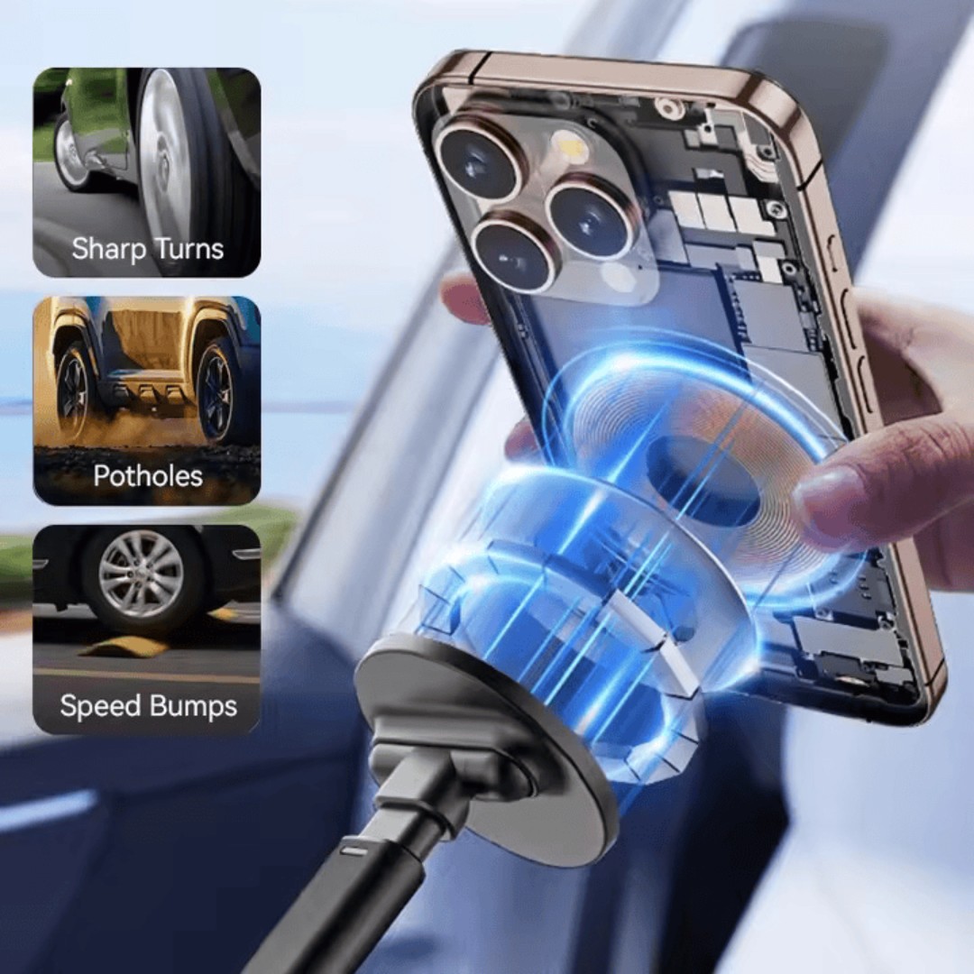 Powerful Magnetic Hold: Equipped with a strong built-in magnet that securely locks your phone in place, staying stable during sharp turns, speed bumps, and rough roads.