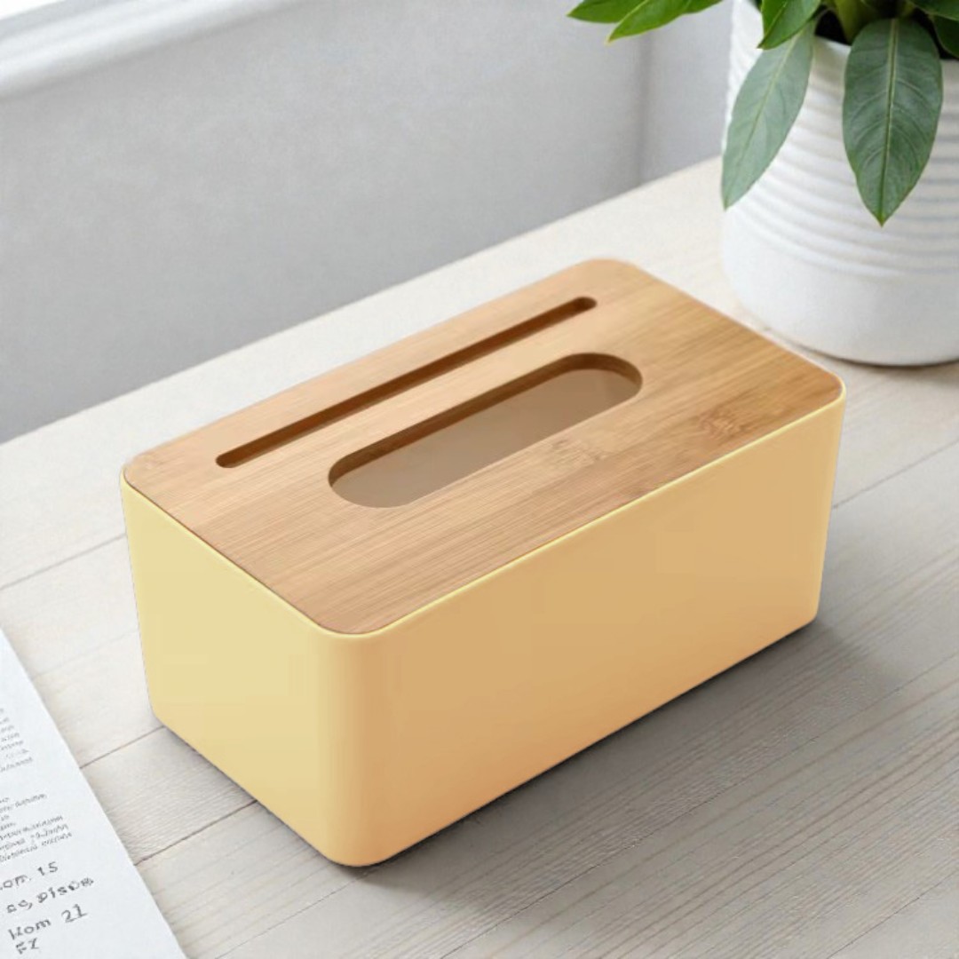 Modern Dual-Material Design: Elegant combination of a smooth plastic body with a natural bamboo lid, creating a stylish tissue box that enhances home, office, or bedside décor.