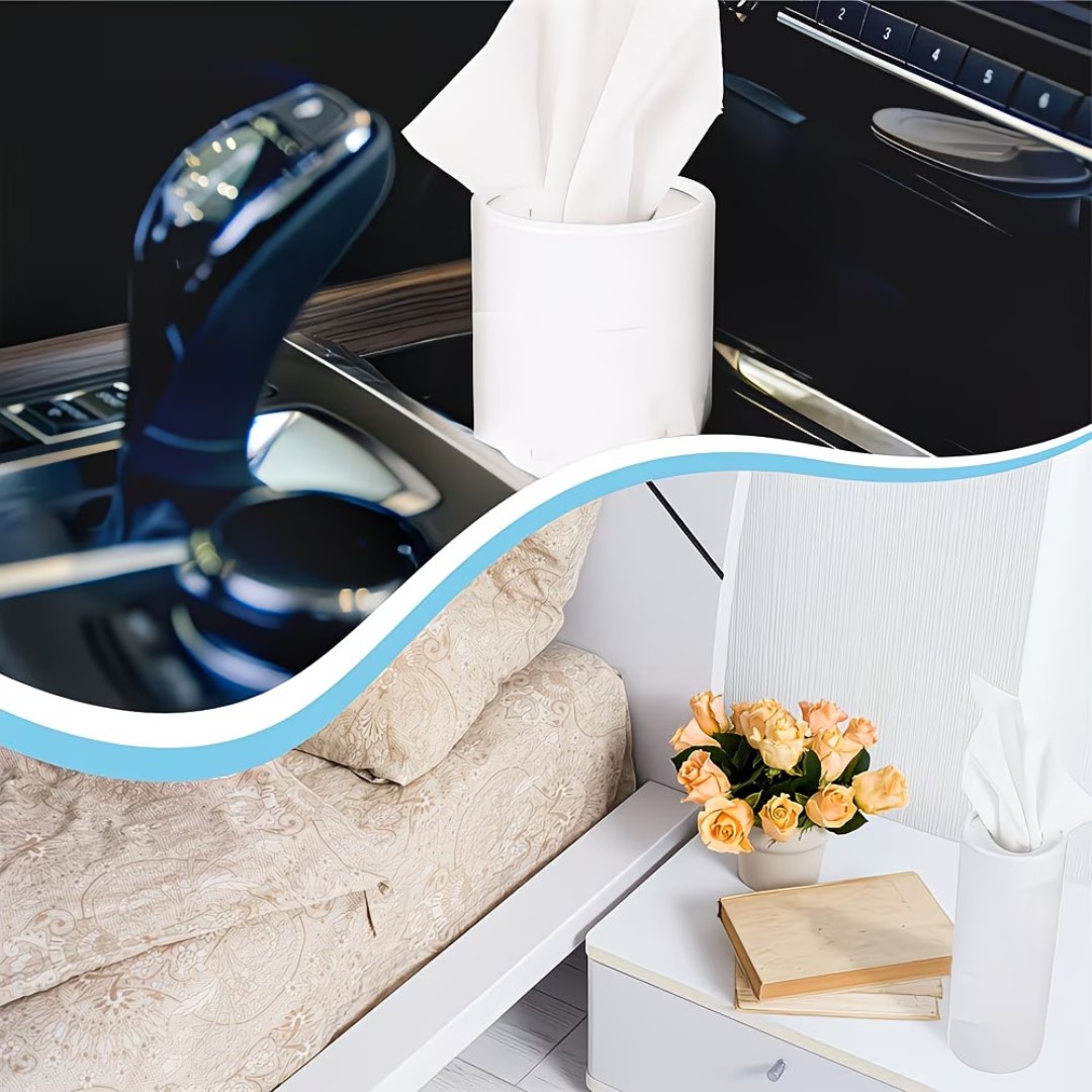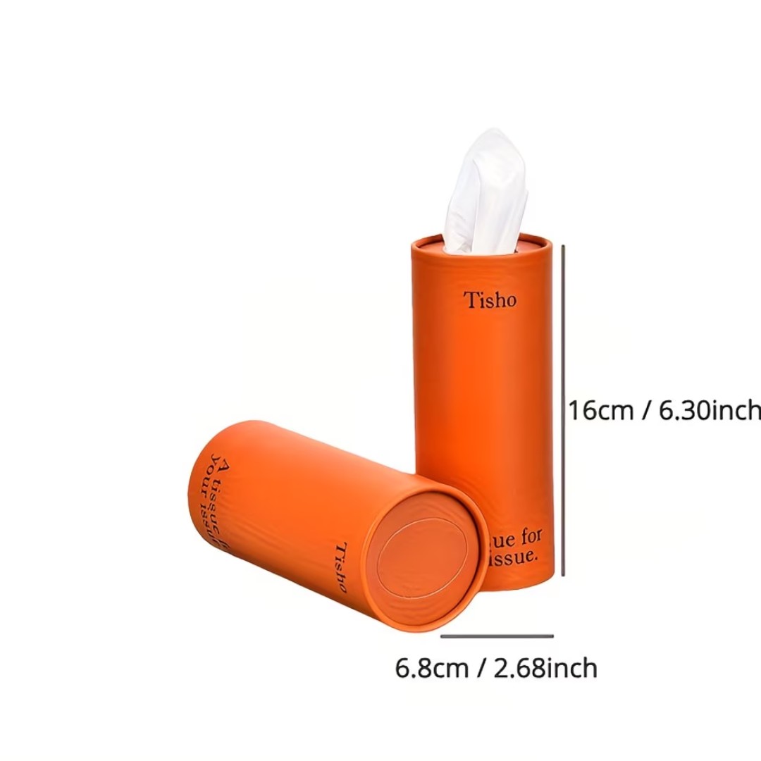 Portable Cylindrical Tissue Holder: Compact vertical design keeps tissues neatly stored and easy to pull out, making it perfect for travel, cars, offices, and bedside use.