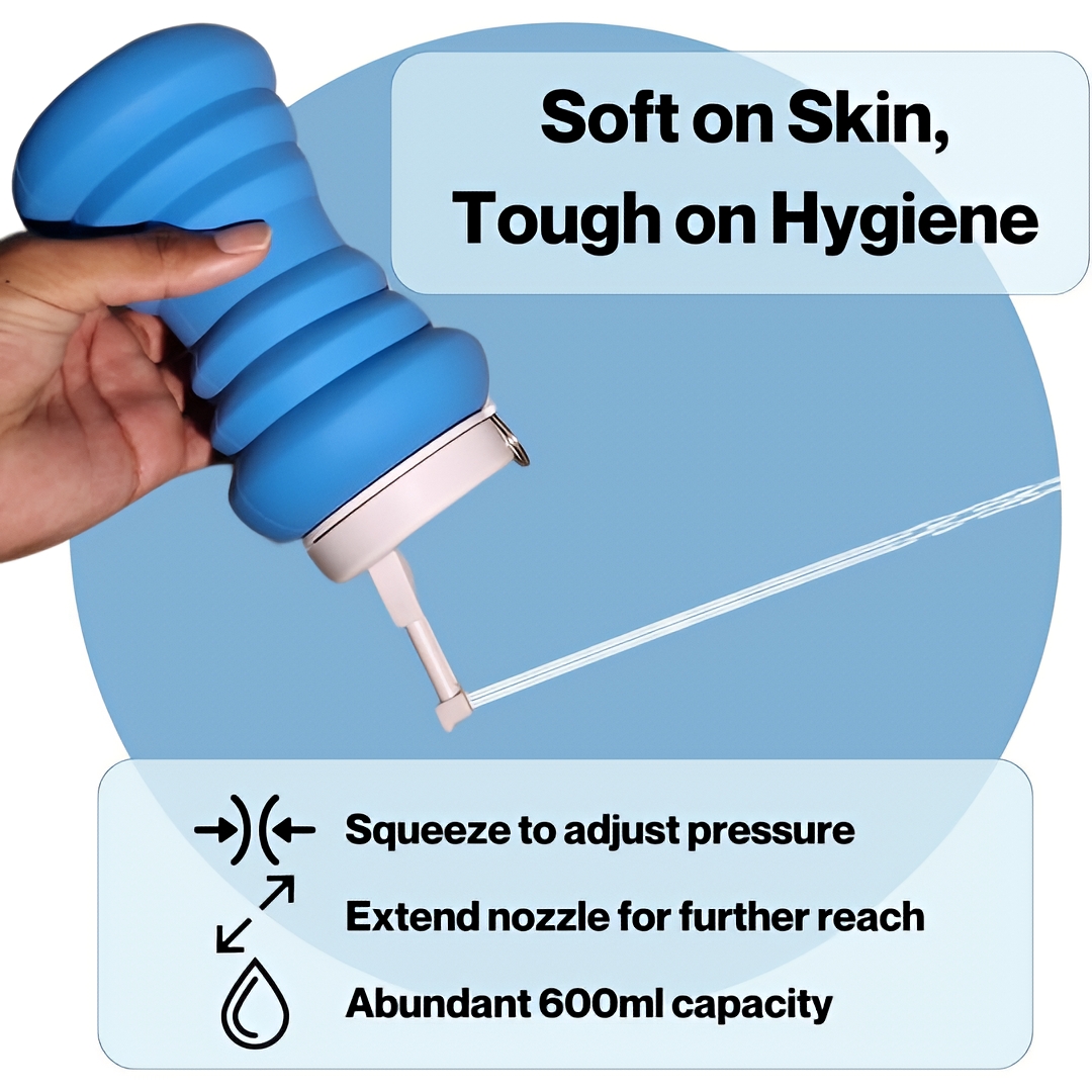 Soft Squeeze Silicone Bottle: Made with an ergonomic soft-squeeze design that allows easy control of water pressure for a smooth and hygienic washing experience.