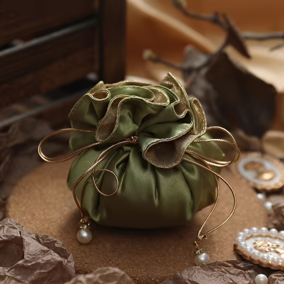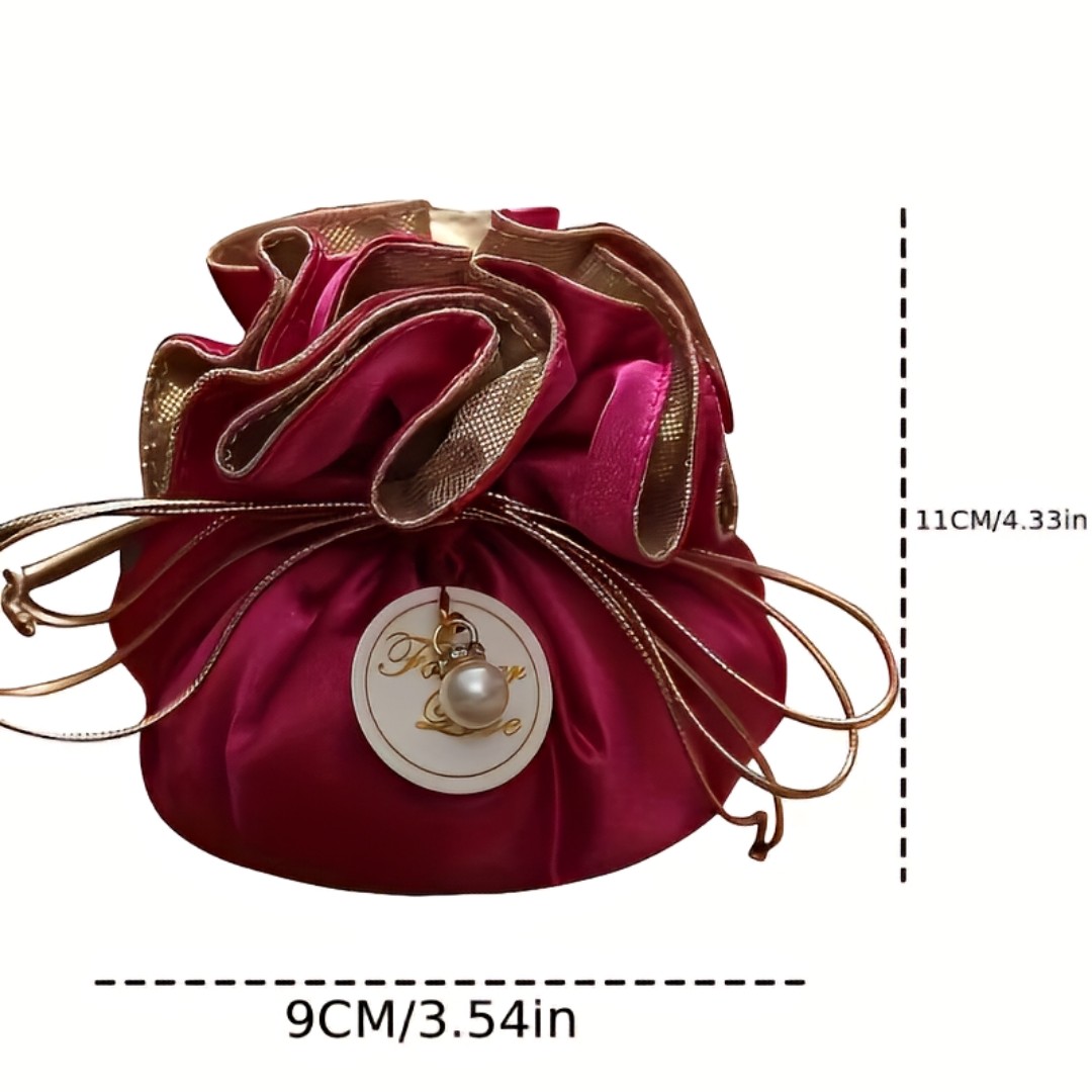 Adjustable Drawstring Closure: Designed with a decorative gold drawstring that easily tightens to securely close the pouch while forming an attractive flower-shaped top.