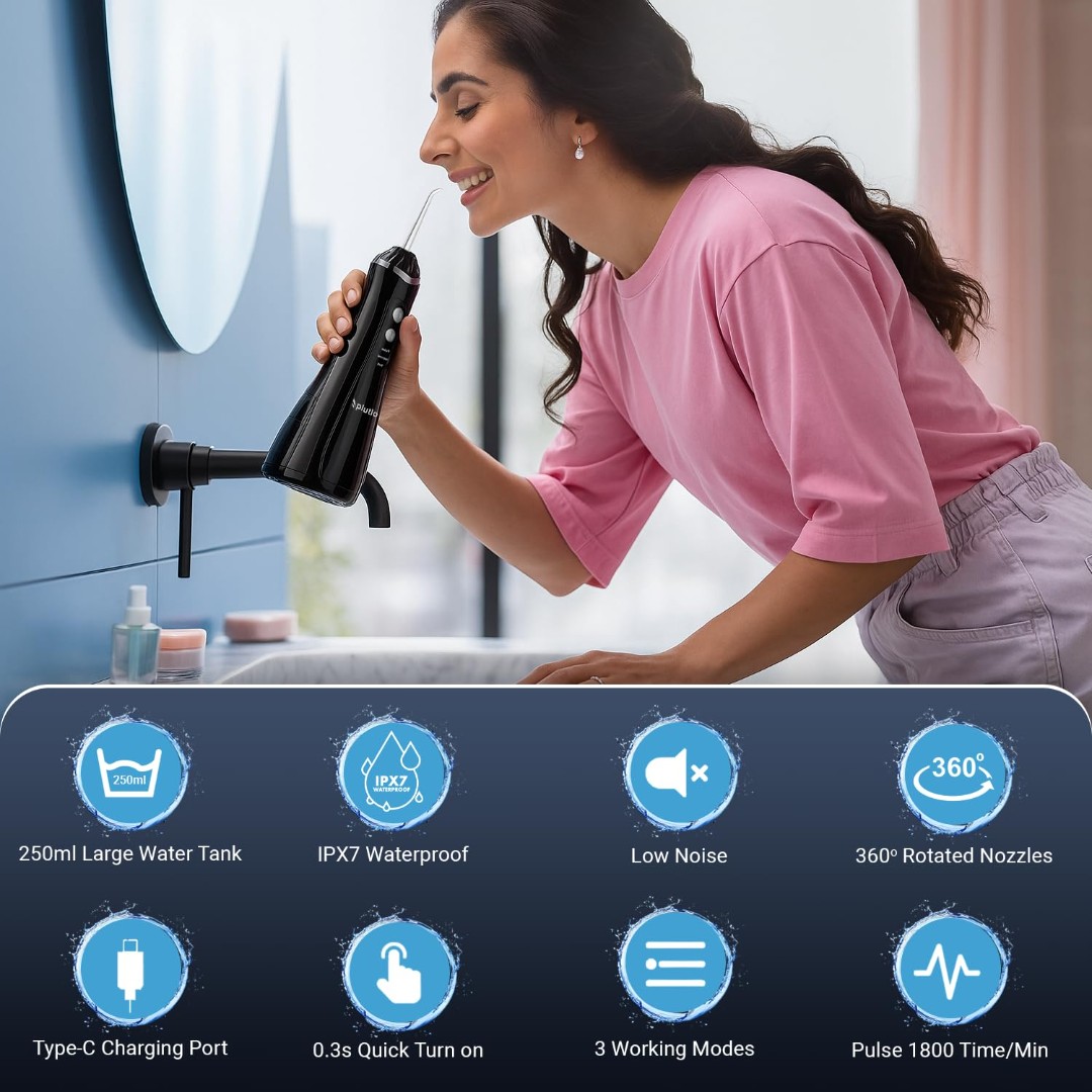 Portable Rechargeable Design: Built with a rechargeable battery and cordless design, making it convenient for home use, travel, and daily dental care routines.
