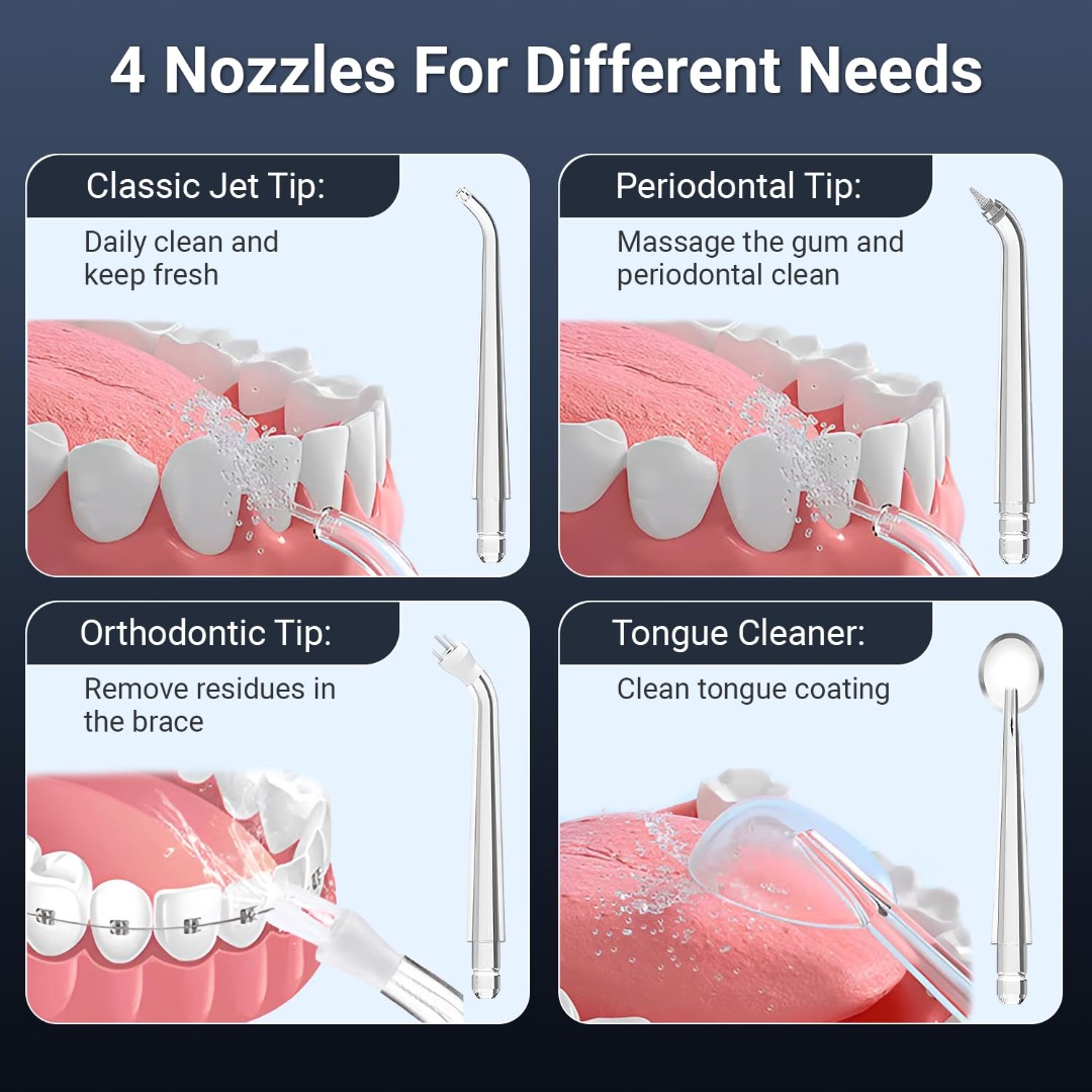 4 Interchangeable Nozzles: Comes with multiple nozzle tips including classic jet tip, periodontal tip, orthodontic tip, and tongue cleaner to support complete oral care and different dental needs.