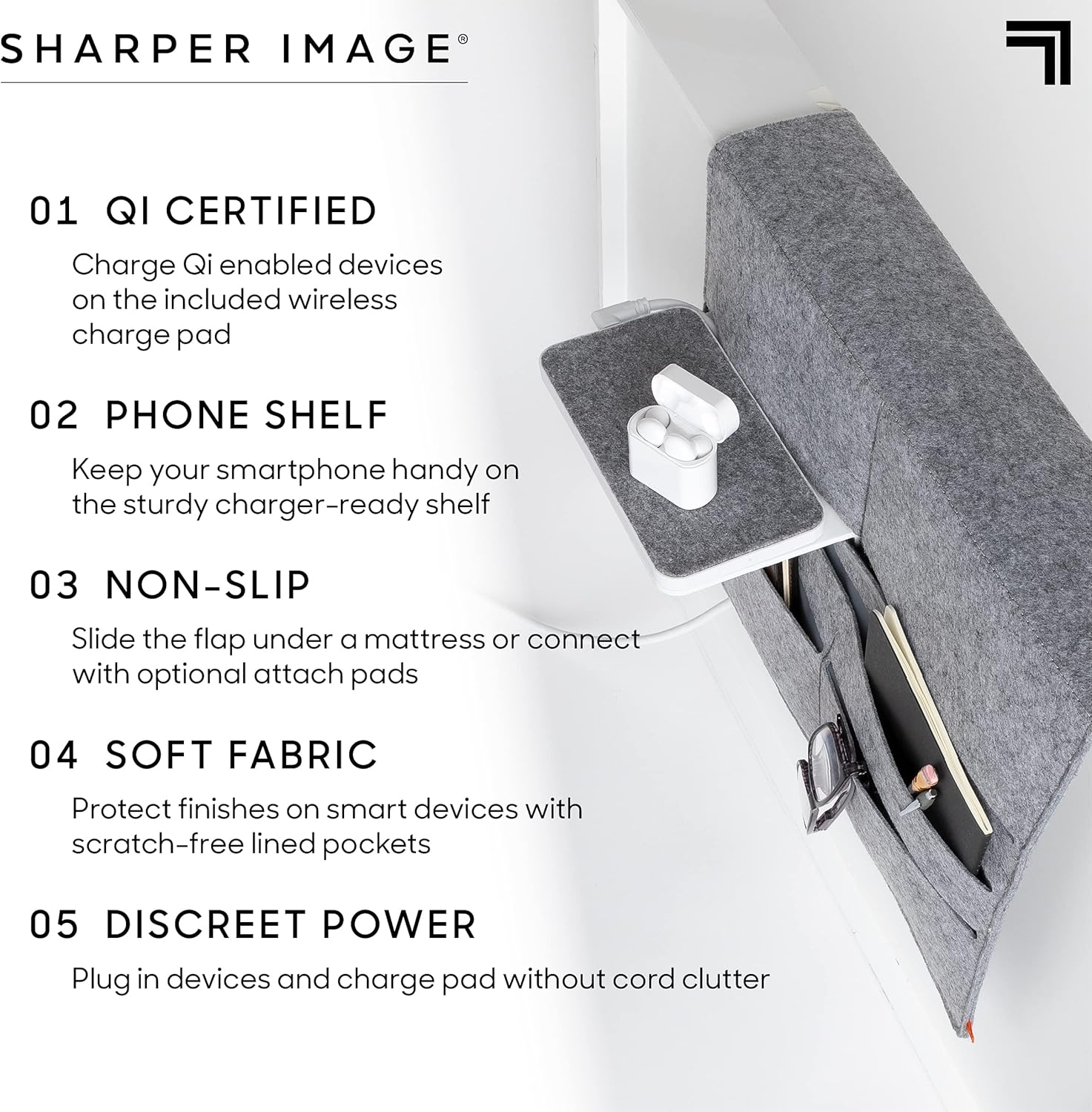 Multi-Pocket Storage System: Designed with multiple compartments to organize books, tablets, glasses, remotes, and personal items neatly in one place.